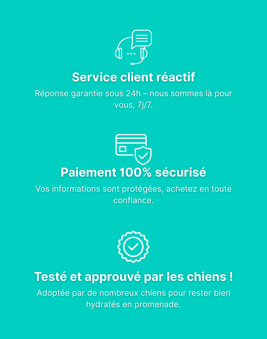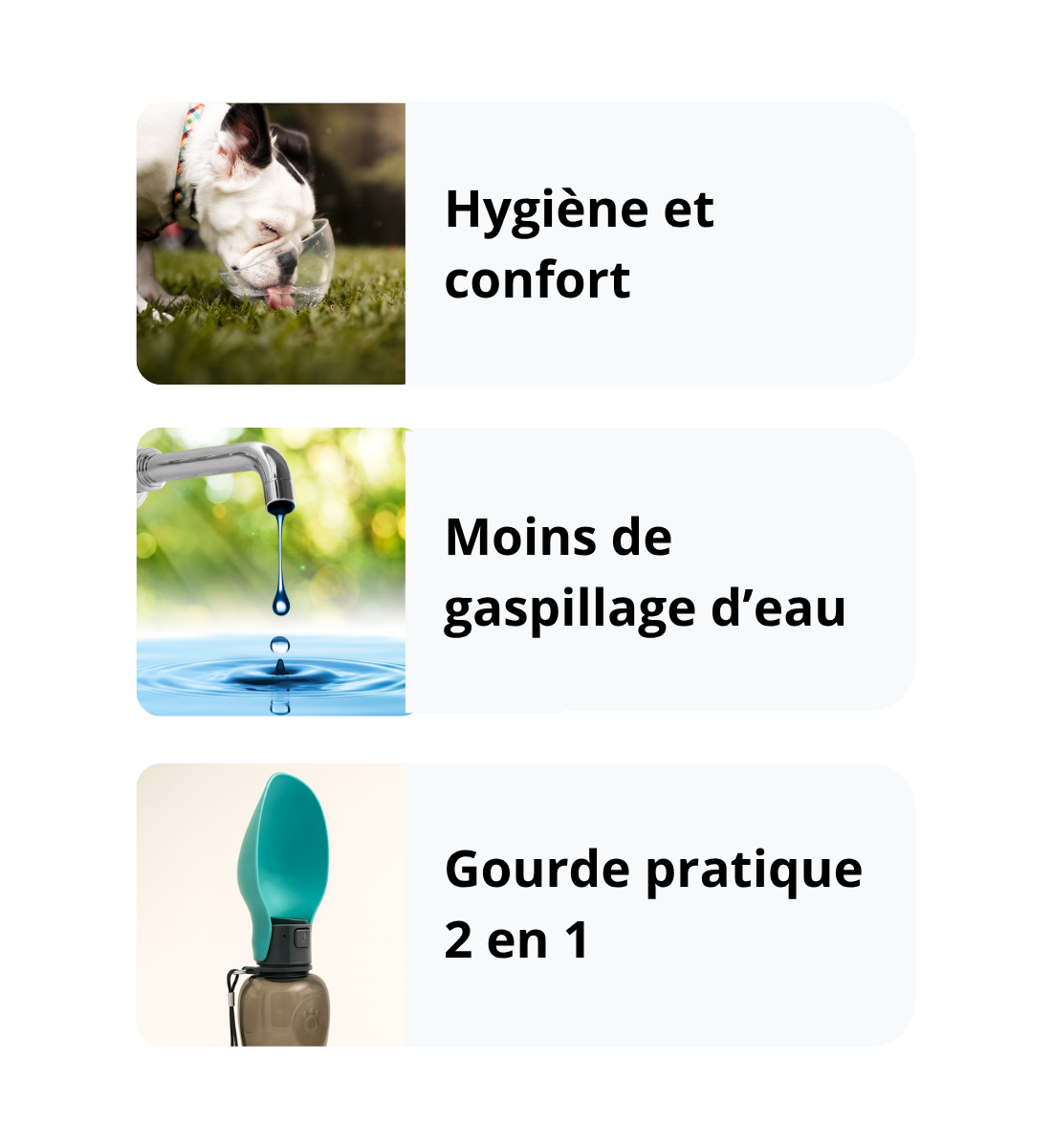 Emportez l’essentiel avec vous : une gourde compacte, pratique, pensée pour le confort et la santé de votre compagnon.